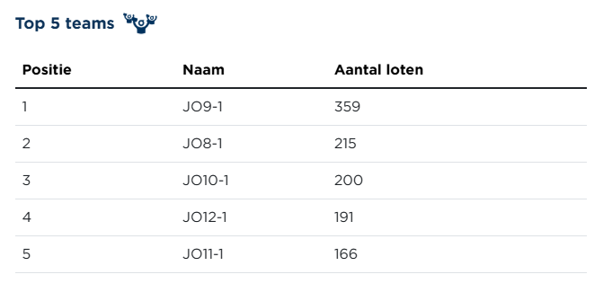 Bij de teams lijkt de beslissing al te zijn gevallen. De JO9-1 staat nu met een straatlengte voorsprong op de eerste plaats. De ploegenprijs lijkt deze ploeg dan ook niet meer te kunnen ontgaan.